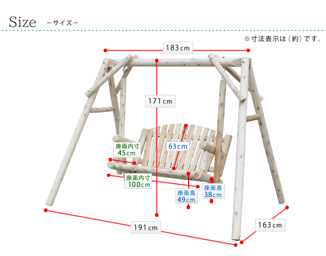 ■商品名 Cedar Looks アメリカンスウィング ■型番 NO26 ■サイズ 本体:幅 約1910×奥行 約1630×高さ 約1710mm ■重量 約45kg ■材質 ホワイトシダー材 ■仕上げ 無塗装 ■組立区分 組み立て式 ■生産国 カナダ ■備考 ※ホワイトシダーは年月を経ると褪色し、シルバーグレーに変色します。